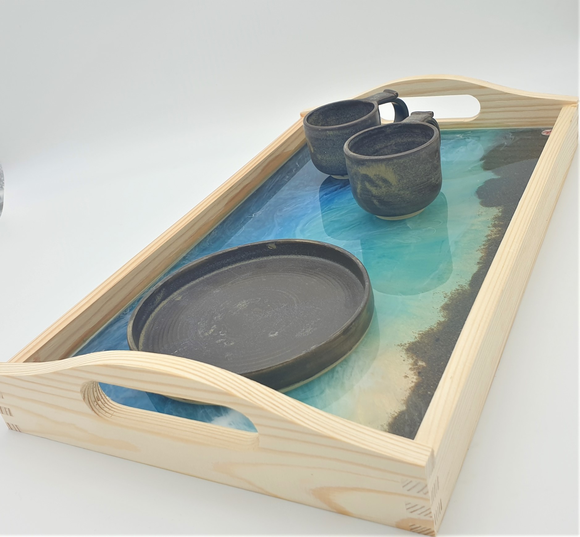 Χειροποίητος δίσκος από ξύλο , διακοσμημένος με υγρό γυαλί και άμμο.